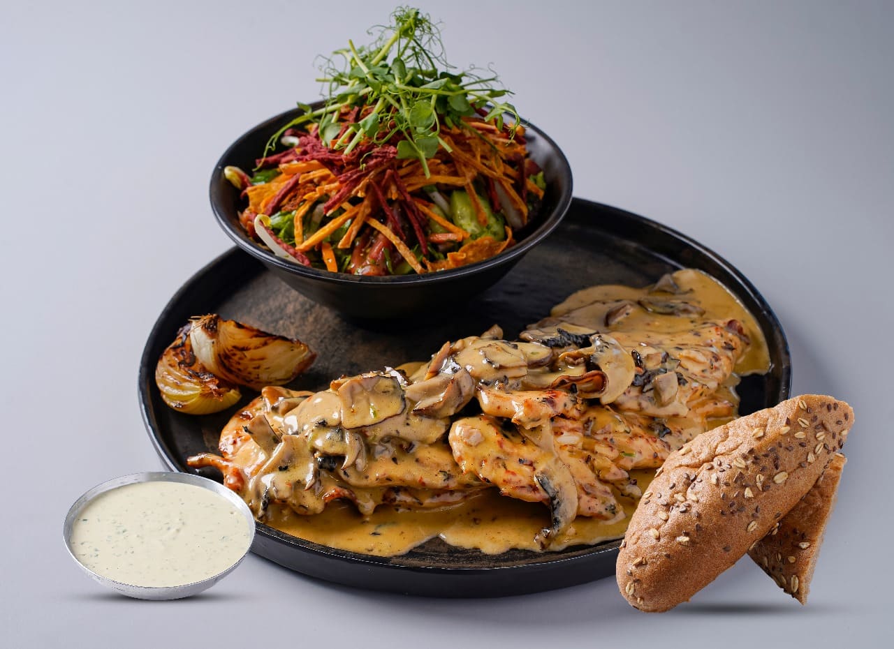 تقدم مع: طبق ساخن | سلطة | خبز قمح | طحينة ,اختر طبق ساخن: رز خضار | فاصولياء خضراء | ماك & تشيز | بطاطا مهروسة | تشيبس.